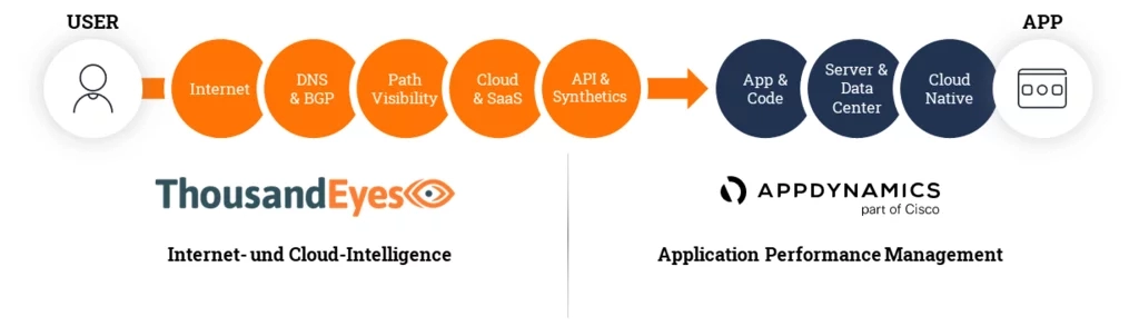 Für einen umfassenden Einblick müssen Software, Hardware und Netzwerk gleichermaßen in den Blick genommen werden. Es gilt das seit Jahrzehnten eingeübte Silo-Denken durch eine komfortable, ganzheitliche Lösung zu überwinden, um die Geschäftsziele (gute Customer Experience, stabile Umsatzzahlen, Kostenkontrolle, etc.) dauerhaft zu erreichen. Eine Kombination aus drei Cisco-Tools steht dafür als Gesamtlösung zur Verfügung.