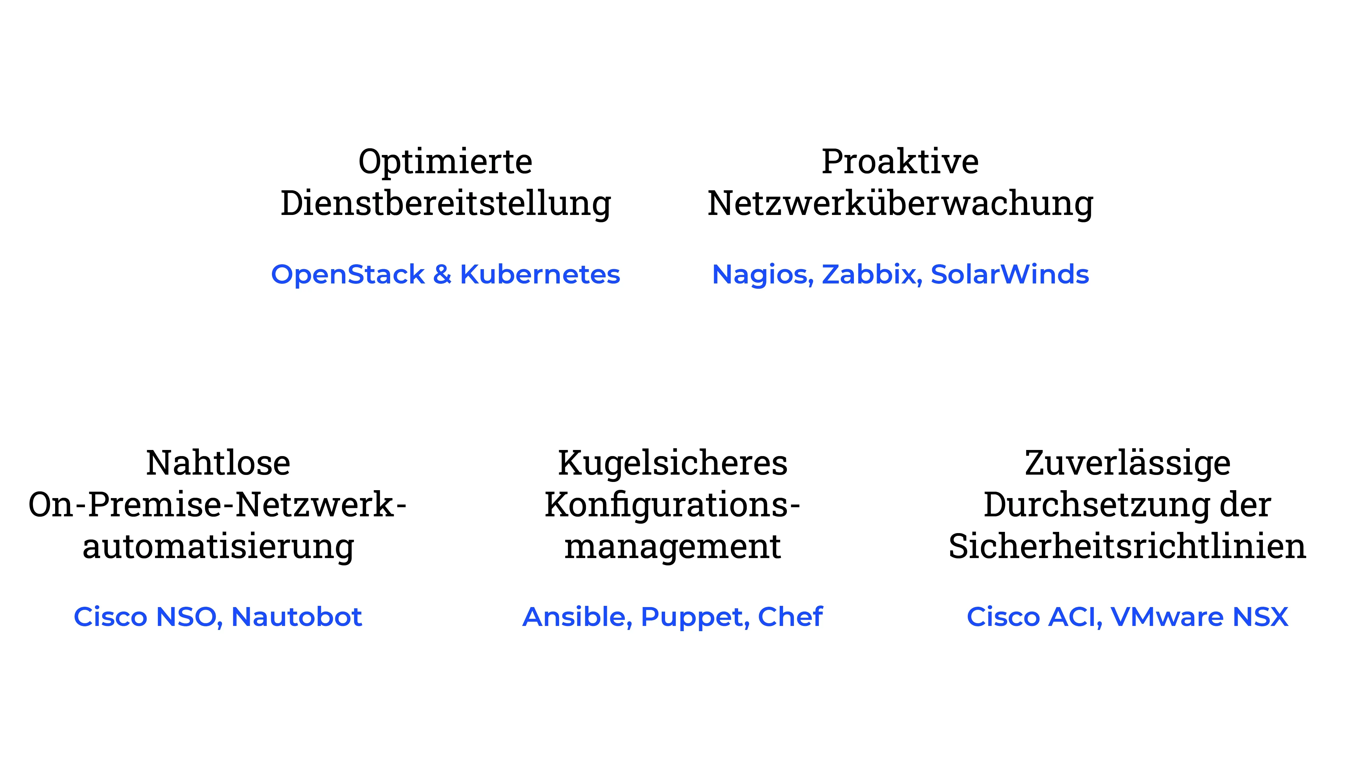 Ansible, Puppet und Chef stellen sicher, dass Netzwerke konsistent konfiguriert und compliant bleiben – weniger Fehler, mehr Betriebszeit.