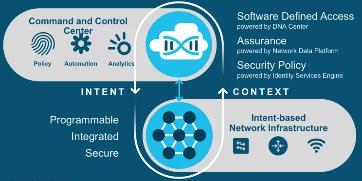 Darüber hinaus hat Cisco mit seiner Digital Network Architecture (DNA) innovative Softwarekomponenten implementiert. Das zentrale Management-Werkzeug ist das Cisco DNA Center. Hier werden alle Netzwerkfunktionen an einem Ort bereitgestellt. Mit SD Access können Zugangsrichtlinien durchgesetzt somit eine kontextbasierte Netzwerksegmentierung hergestellt werden. Die Analyseplattform Network Data Platform & Assurance kategorisiert Telemetriedaten korreliert Informationen aus den Logs für die zuständigen Netzwerk-Administratoren und Security-Teams.